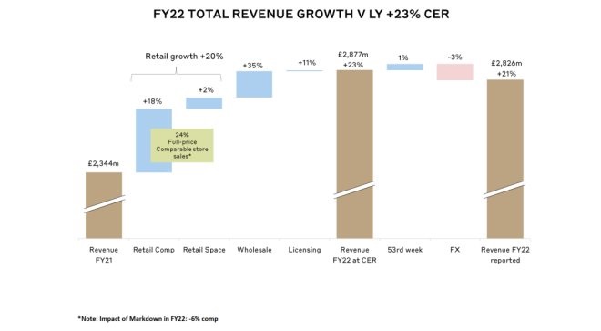 Burberry集團2022財年營收按固定匯率計算同比增長23%至28.26億英鎊,調(diào)整后運營利潤增長38%至5.23億英鎊,超出預(yù)期,運營利潤率提升至19.0%。