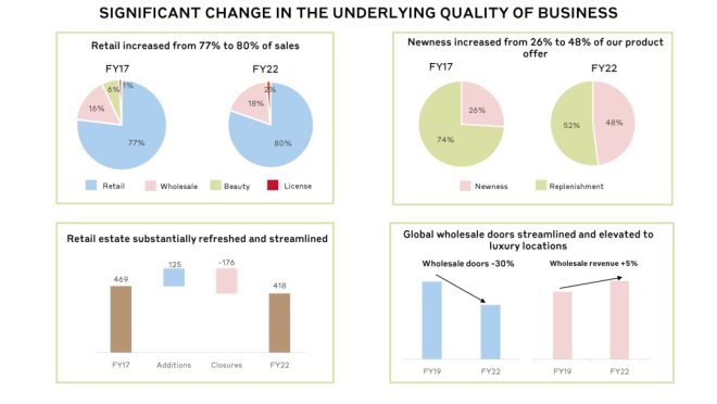 2018-20財年:建立基礎(chǔ) —— 重新確立了奢侈品地位,轉(zhuǎn)變產(chǎn)品風(fēng)格,重組分銷渠道,穩(wěn)定了營收和利潤