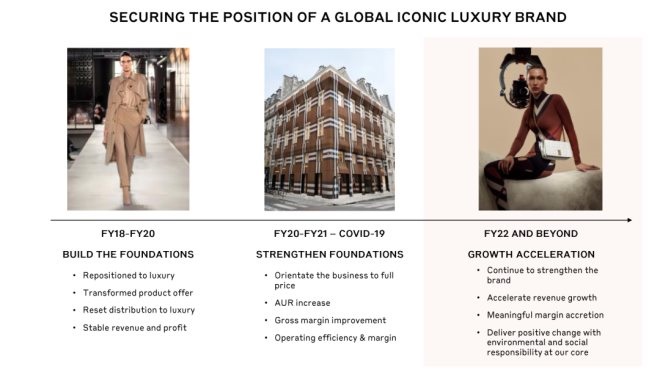 為重新確立全球標志性奢侈品牌定位,Burberry集團在2018財年到2022財年設(shè)定了三個階段的工作重點: