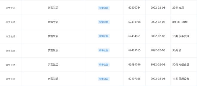 值得注意的是,根據(jù)企查查顯示,今年1月30日和2月8日,奈雪申請(qǐng)了“奈雪生活”21個(gè)商標(biāo),國(guó)際分類(lèi)涉及廣告銷(xiāo)售、餐飲住宿、服裝鞋帽、酒、食品等,目前這些商標(biāo)都處于初步審定狀態(tài)。