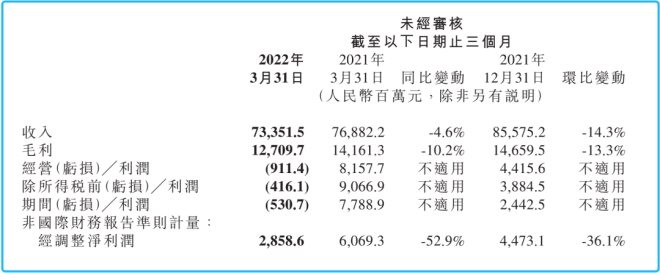 “2022年第一季度,小米實現(xiàn)營收733.52億元,同比下滑4.6%;期內(nèi)虧損5.31億元,去年同期盈利77.89億元;調(diào)整后凈利潤28.59億元,同比下滑52.9%!