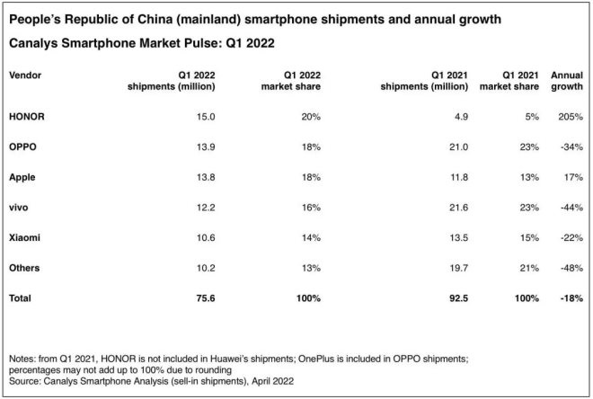 市場分析機構(gòu)Canalys最新報告指出,2022年第一季度,全球智能手機出貨量同比下降11%。中國信通院的報告顯示,今年1至3月,國內(nèi)市場手機總體出貨量為6934.6萬部,同比下降29.2%。
