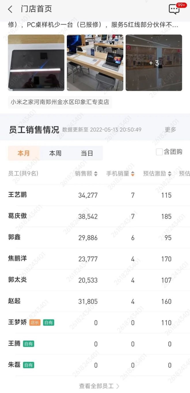 上周,小米河南分公司總經(jīng)理王騰的微博也側(cè)面印證了上述從業(yè)者的看法。5月13日,王騰在河南一家線下小米之家門店體驗之后,在網(wǎng)上曬出了門店員工銷售情況統(tǒng)計表。從曬出的截圖中可以看出,該小米之家包括王騰在內(nèi)一共有員工9名,其中銷售額最高的員工賣出了7臺手機,銷售額38542元,預(yù)估激勵185元。