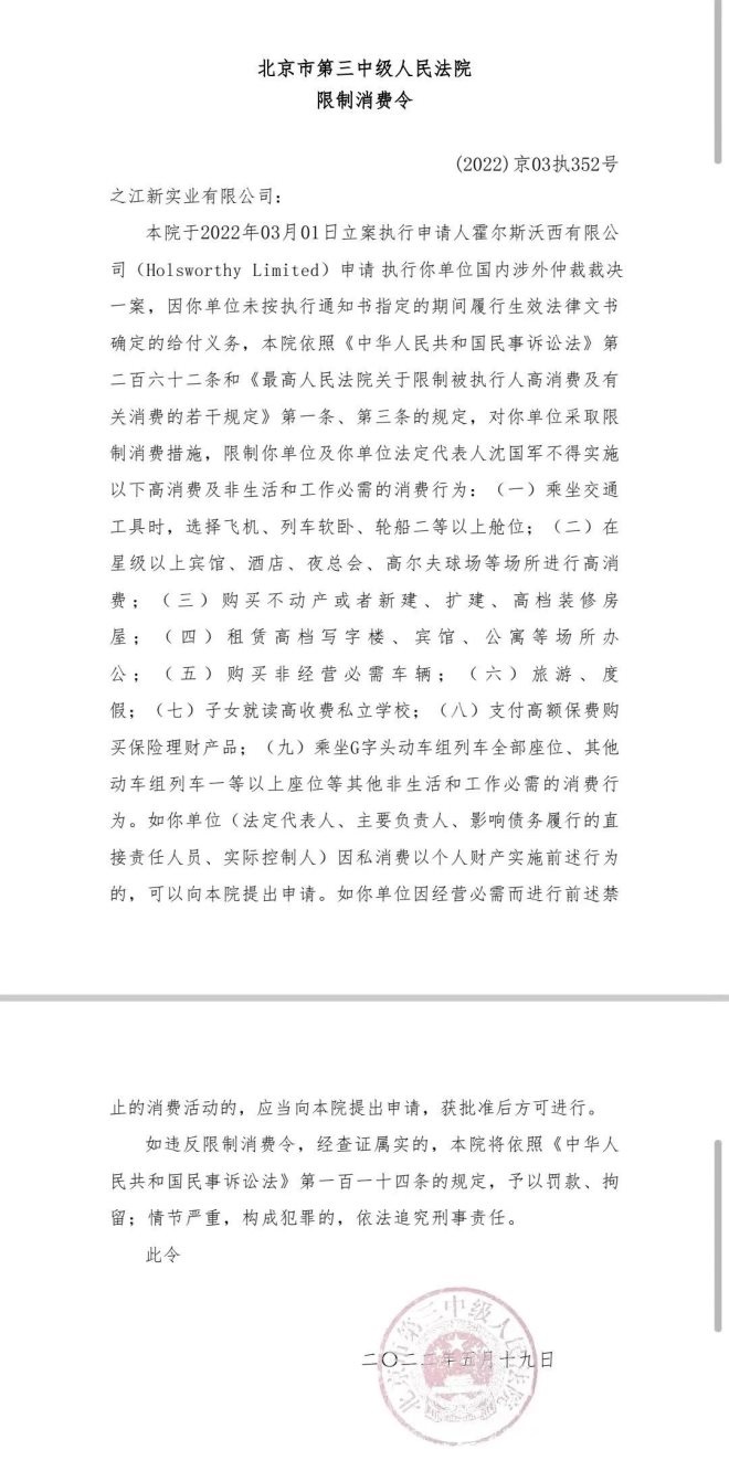 據(jù)悉,北京市第三中級人民法院于2022年3月1日立案執(zhí)行申請人霍爾斯沃西有限公司(Holsworthy Limited)申請執(zhí)行之江新實業(yè)國內(nèi)涉外仲裁裁決一案,因之江新實業(yè)未按執(zhí)行通知書指定的期間履行生效法律文書確定的給付義務(wù),北京市第三中級人民法院依照有關(guān)規(guī)定,對之江新實業(yè)采取限制消費(fèi)措施,限制之江新實業(yè)及法定代表人沈國軍不得實施高消費(fèi)及非生活和工作必需的消費(fèi)行為。