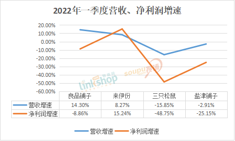 一季度,三只松鼠營收30.9億元,同比下滑15.85%;雖然凈利潤實(shí)現(xiàn)1.6億元,但同比下滑48.75%。良品鋪?zhàn)訝I收29.42億元,同比增長14.30%,但凈利潤為9306.11萬元,同比下滑了8.86%。