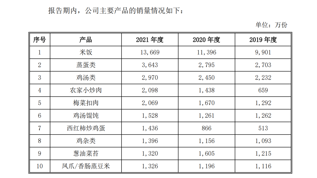 更有趣的是,在正式披露招股書中,內(nèi)餐君發(fā)現(xiàn)老鄉(xiāng)雞光是在2021年就賣掉了1.37億碗大米飯,且米飯?jiān)诠局饕a(chǎn)品銷售量中排名第一。