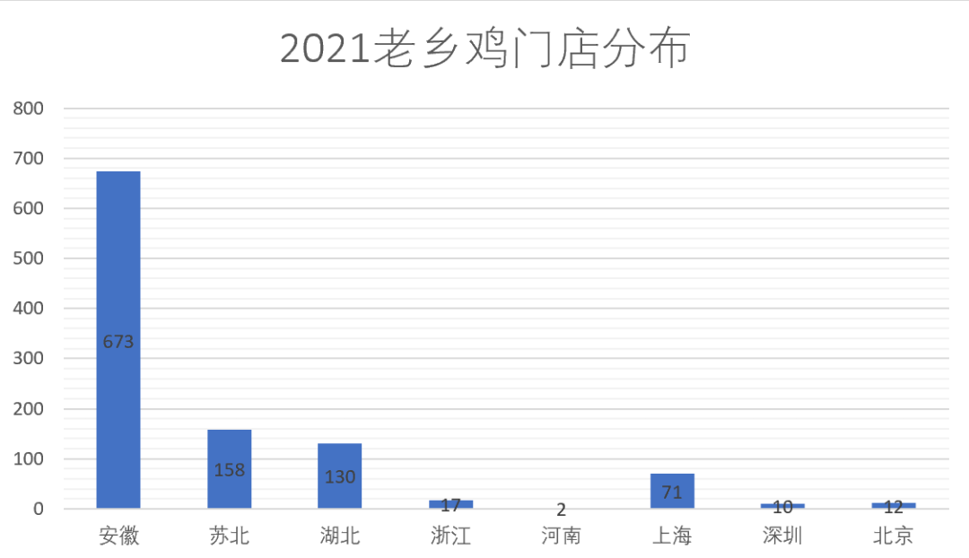 從門店分布區(qū)域看,老鄉(xiāng)雞門店大部分分布在安徽,1073家門店中,有673家分布在起家的安徽省。不過(guò)可以看到,近兩年,上海、北京、深圳等一線城市的開(kāi)店速度非?。