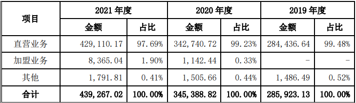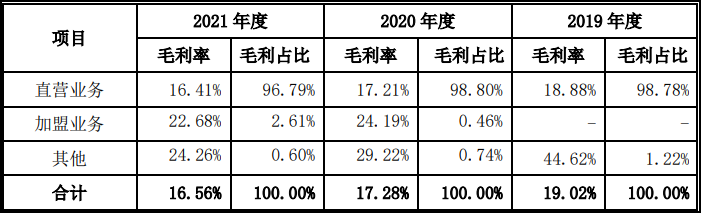 從毛利率情況來(lái)看,報(bào)告期內(nèi),直營(yíng)業(yè)務(wù)毛利率16.41%,低于加盟業(yè)務(wù)的毛利率22.68%。說(shuō)明加盟店更賺錢一點(diǎn)。