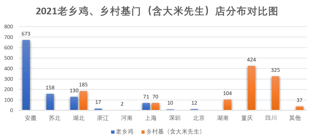 在區(qū)域分布上,兩者都有“大本營(yíng)”,老鄉(xiāng)雞的大本營(yíng)在安徽,鄉(xiāng)村基的大本營(yíng)在四川。前者在安徽673家店,后者在四川共有325家門店。