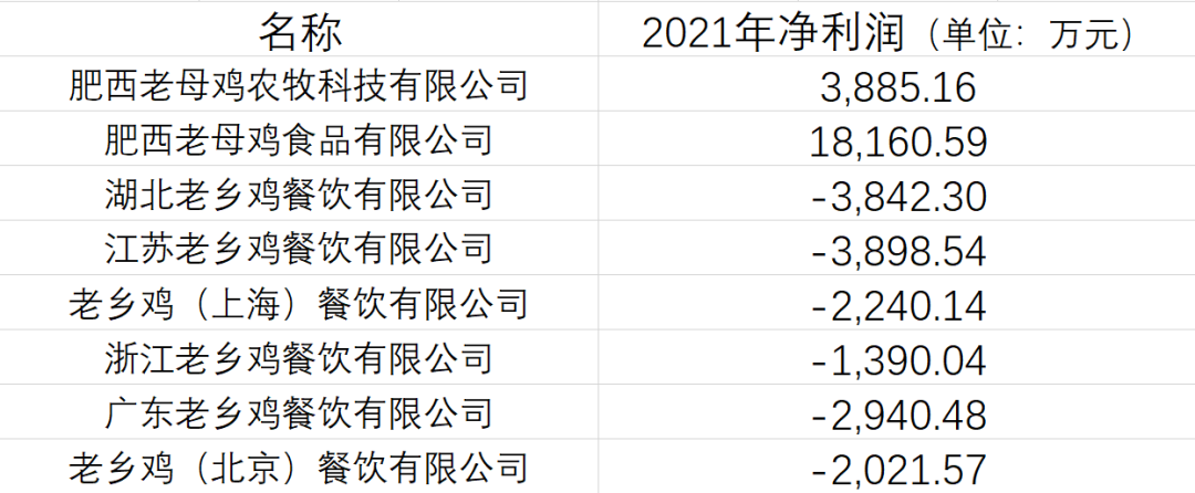 在老鄉(xiāng)雞全資子公司的盈利數(shù)據(jù)中可見(jiàn),除“農(nóng)牧科技有限公司”、“肥西老母雞食品有限公司”凈利潤(rùn)為正增長(zhǎng)以外,安徽、湖北、江蘇、上海、浙江、廣東、北京各地餐飲公司凈利潤(rùn)均負(fù)增長(zhǎng)。也就是說(shuō),上游養(yǎng)殖業(yè)、屠宰加工以及零售業(yè),撐起了老鄉(xiāng)雞的盈利。而作為上市主體的餐飲板塊反而“全部虧損”。