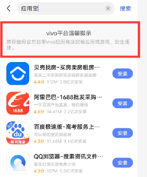 比如用vivo的應(yīng)用商店搜索“應(yīng)用寶”,發(fā)現(xiàn)根本沒有,還會被“溫馨提示”使用自帶的才安全便捷。
