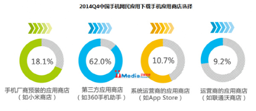 2014年Q4中國手機網(wǎng)民應(yīng)用下載手機應(yīng)用商店選擇(數(shù)據(jù)來源:艾媒咨詢)
