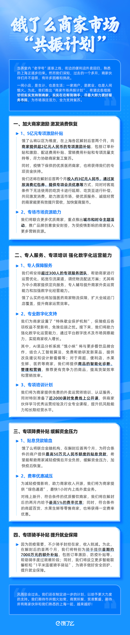 據(jù)悉,面向上海,餓了么“共振計(jì)劃”包括四大舉措:解封后首兩月,將提供5億元激勵(lì),降低經(jīng)營成本,加快生意恢復(fù);提供專項(xiàng)降費(fèi)補(bǔ)貼,緩解資金壓力;專人輔導(dǎo)培訓(xùn)、進(jìn)行數(shù)字化支持,提升商家運(yùn)營能力;同時(shí),首期為騎手提供近7000萬元額外補(bǔ)貼,提升就業(yè)保障。