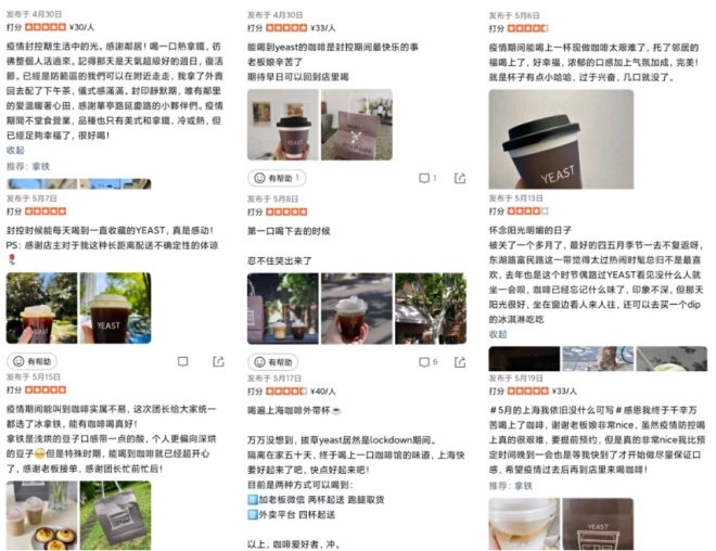 在復(fù)工的40天里,何姍澤也受到很多顧客溫暖的反饋,“能喝到Y(jié)EAST的咖啡是封控期間最快樂的事情”、“老板娘親自送過來,期待早日到店里喝”、“很慶幸距離YEAST這么近,每一杯都很珍貴”等等。