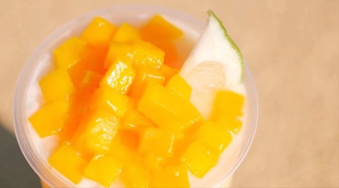 其中,“芒果蛋蜜汁”是用無(wú)菌蛋黃液、芒果肉、麻薯一起攪打制作而成。