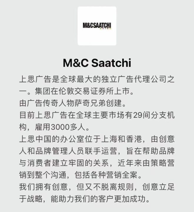 據(jù)悉,M&C Saatchi在中國的運(yùn)營主體是上思廣告(上海)有限公司(下稱“上思廣告”)。天眼查APP顯示,上思廣告成立日期為2002年9月,法定代表人為劉新海,大股東為尚思咨詢(香港)有限公司。主要經(jīng)營范圍為設(shè)計(jì)、制作、發(fā)布、代理國內(nèi)外各類廣告,市場營銷咨詢、企業(yè)形象策劃咨詢等。