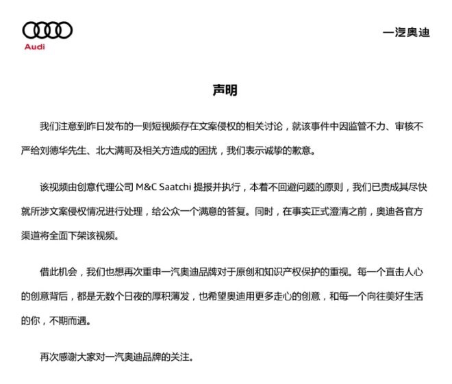 針對傳得沸沸揚(yáng)揚(yáng)的抄襲事件,5月22日上午,奧迪發(fā)布聲明,稱注意到關(guān)于短視頻存在文案侵權(quán)的相關(guān)討論,并就該事件中因監(jiān)管不力,審核不嚴(yán)給劉德華先生、北大滿哥及相關(guān)方造成的困擾表示誠摯的歉意。