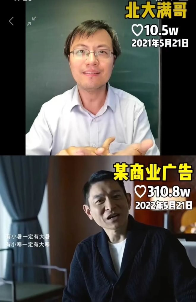 在曝光視頻中,北大滿哥表示,他曾在2021年5月21日小滿節(jié)氣前,于抖音發(fā)布時長約兩分鐘的視頻《為什么一年中最好的節(jié)氣是小滿》,而此次奧迪《人生小滿》廣告短片中的文案,與他的視頻的部分文案高度重合。