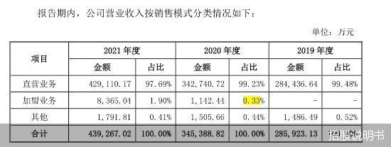 面對向外擴張的壓力,老鄉(xiāng)雞終究還是選擇了開放加盟這條路,在此次招股書中也首次公開披露了加盟業(yè)務(wù)。根據(jù)招股書,老鄉(xiāng)雞自2020年開展加盟業(yè)務(wù),該業(yè)務(wù)2020年和2021年收入分別為1142萬元和8365萬元,分別占公司營業(yè)收入的0.33%、1.90%。截至2021年12月31日,老鄉(xiāng)雞共有82家加盟門店,其中安徽、江蘇和河南分別有54、26、2家加盟店。