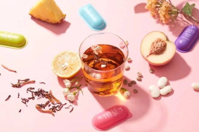 “膠囊茶”也是近兩年比較風(fēng)靡的茶葉產(chǎn)品新形態(tài),是將多種形態(tài)、質(zhì)地的原料,縮進(jìn)一顆膠囊里。
