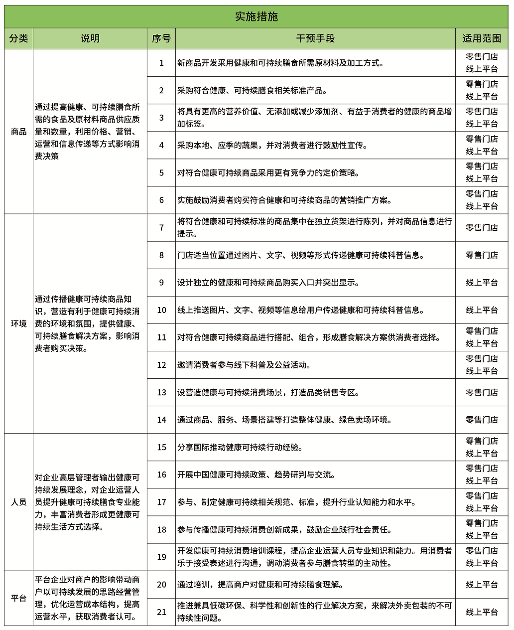 《手冊》從商品、環(huán)境、人員、平臺等四個(gè)維度,識別出21個(gè)適用于中國市場的健康可持續(xù)膳食實(shí)施方案,邀請相關(guān)專家和行業(yè)、企業(yè)代表對措施從重要性和可行性評估,并依據(jù)評估結(jié)果制定有助于企業(yè)實(shí)施措施的工作計(jì)劃,未來將與行業(yè)一起持續(xù)開展工作幫助消費(fèi)者通過消費(fèi)建立健康可持續(xù)的生活方式。