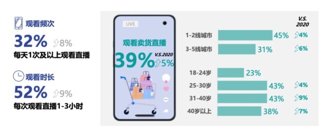 事實上,像小滿這樣的消費者正在逐漸增多,益普索(Ipsos)發(fā)布的《2021直播電商趨勢報告》顯示,2021年,在互聯(lián)網(wǎng)用戶中,每天觀看賣貨直播1次及以上的用戶同比增長8個百分點達到32%,每次觀看直播1-3小時的用戶同比增長9個百分點達到52%。