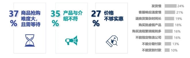 但同時,對于直播電商,用戶們還有諸多不滿意的地方。《報告》顯示,37%的用戶抱怨“商品搶購難度大,且需等待”,35%的用戶認為“產(chǎn)品與介紹不符”。