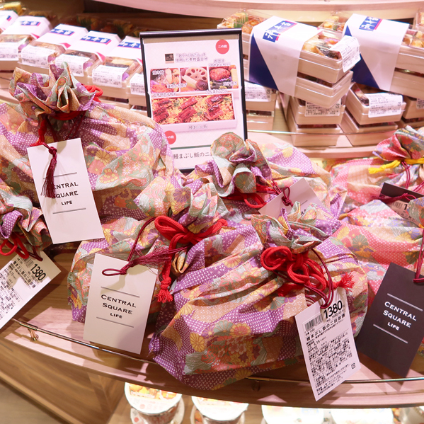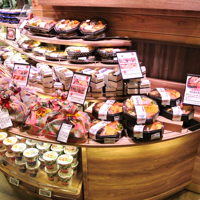 熟食的品項(xiàng)數(shù)是LIFE所有門店中最多的,便當(dāng)是普通門店的1.5倍。采用透明開放式加工間,突出現(xiàn)場(chǎng)烹制的氛圍。重點(diǎn)經(jīng)營節(jié)假日的高價(jià)格帶商品,如用日式便當(dāng)布袋包裝的國產(chǎn)牛肉飯雙層御膳(1580日元)、鰻魚飯雙層御膳(1380日元)等。