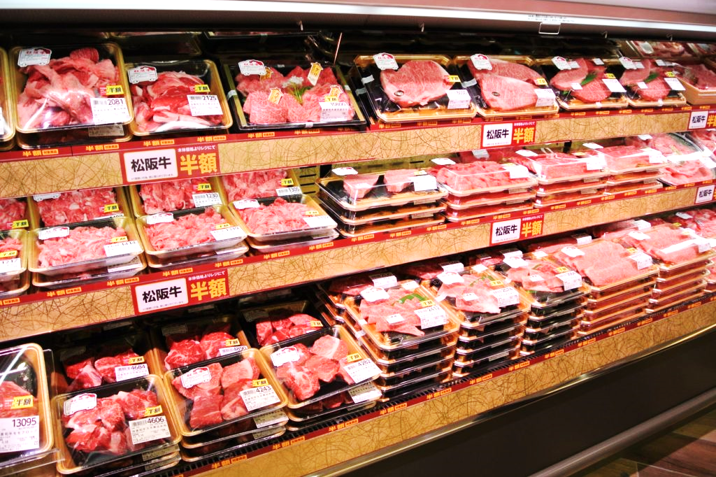 肉類區(qū)域名稱YEBISU MARCHE,經(jīng)營高端黑毛和牛“壹岐!薄布{黑豬肉、鹿兒島產(chǎn)地的品牌雞肉,高端牛肉采用稱重式銷售。開業(yè)當(dāng)天將知名度極高的松阪牛進(jìn)行半價(jià)銷售,吸引顧客來店。