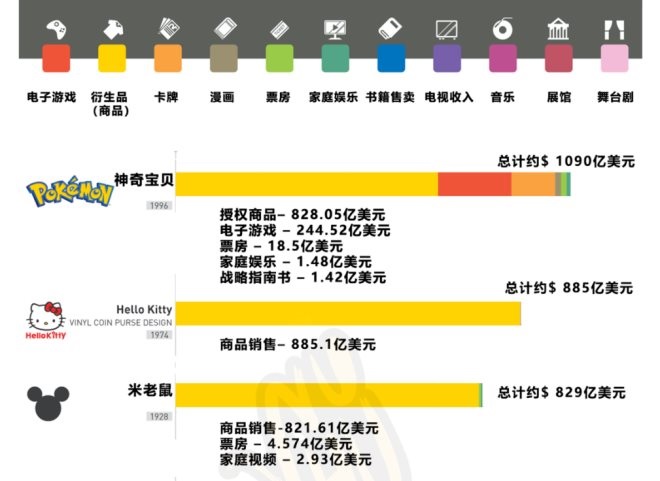 在寶可夢(mèng)1090億美元的收入中,有828億美元來自于衍生授權(quán),約占總收入的四分之三,寶可夢(mèng)公司的大股東任天堂也實(shí)現(xiàn)了躺賺。