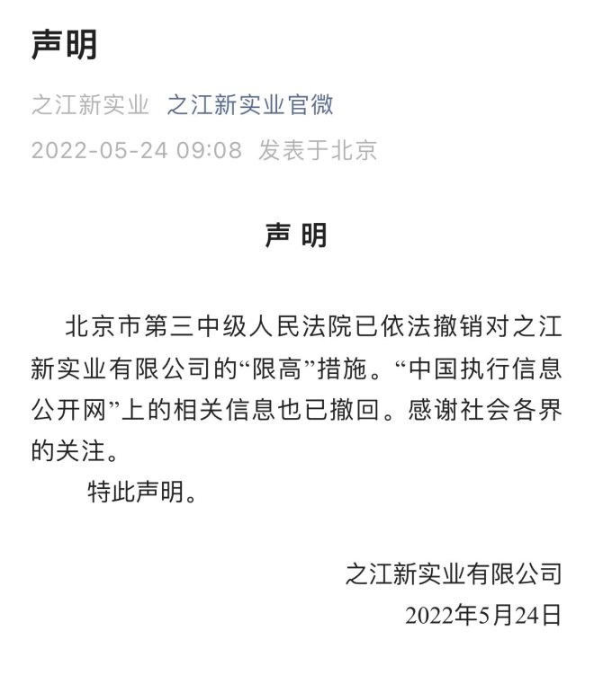 5月24日,“之江新實業(yè)官微”發(fā)布聲明稱:北京市第三中級人民法院已依法撤銷對之江新實業(yè)有限公司的“限高”措施!爸袊鴪(zhí)行信息公開網(wǎng)”上的相關(guān)信息也已撤回。