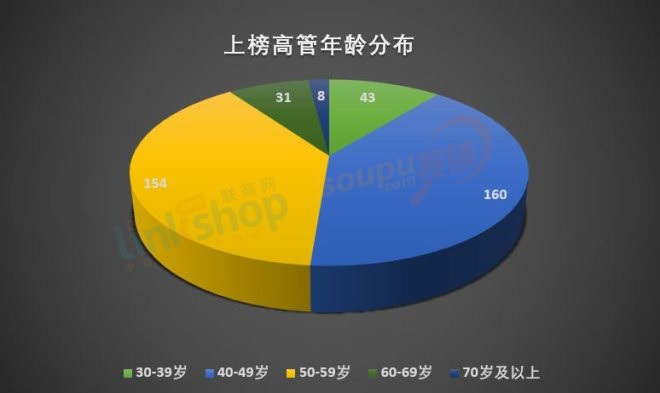 具體各年齡結(jié)構(gòu)上榜人數(shù)如下: 30-39歲之間上榜43人,占比11.14%;40-49歲之間上榜160人,占比41.45%;50-59歲之間上榜154人,占比39.90%;60-69歲之間上榜31人,占比8.03%;70歲及以上上榜8人,占比2.07%。