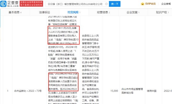 5月25日消息,企查查APP顯示,一點(diǎn)點(diǎn)奶茶關(guān)聯(lián)公司日日饌(浙江)餐飲管理有限公司舟山長(zhǎng)峙島分公司,因銷售超過保質(zhì)期的食品被舟山市市場(chǎng)監(jiān)督管理局新城分局罰款1.5萬。