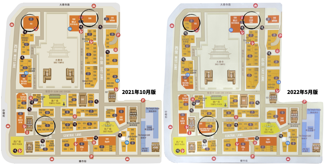 1113號(hào)店鋪被拆分為3個(gè),其中1113a為Yohji Yamamoto山本耀司,1113b為ETRO的廣告圍擋;1309號(hào)店鋪從未標(biāo)注變化為L(zhǎng)EGO樂高;11棟的1201a、1201b、1203、1205共計(jì)4家店鋪,與新標(biāo)注了鋪位號(hào)1120的廣東會(huì)館,一起合并為路易威登之家