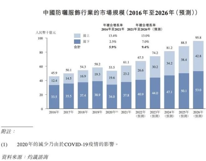 同樣來自灼識咨詢的報告資料,中國的防曬服飾市場規(guī)模已經(jīng)由 2016 年的 459 億元增至 2021 年的 611 億元,按照相似的增速預計, 2026 年將達到 958 億元。