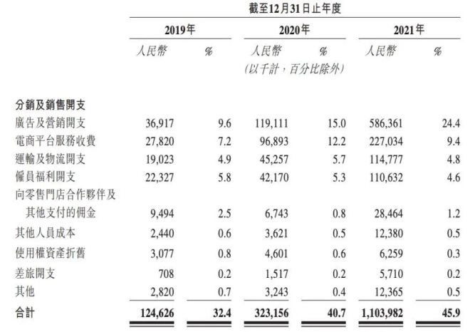 2019-2021三年間,蕉下花費在分銷及銷售上的開支分別為1.24億元、3.23億元及11.04億元,分別占總收入的32.4%、40.7%及45.9%。