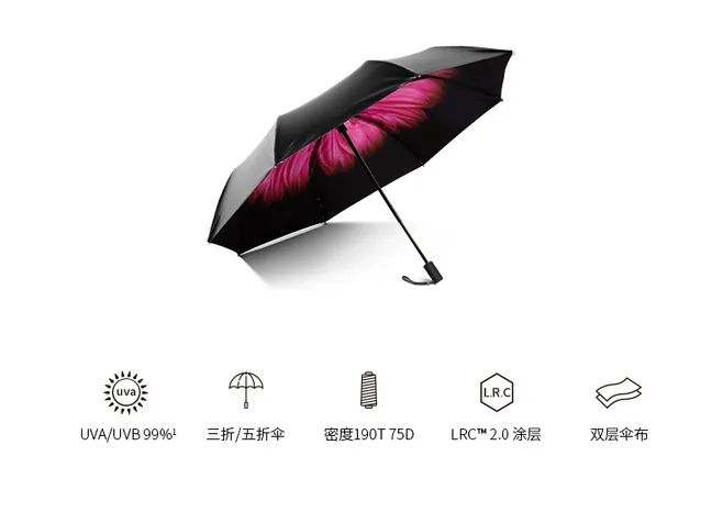 其所使用的L.R.C涂層,據(jù)介紹是一種紫外線阻隔率達99%的科技型涂層,隔熱和遮陽效果數(shù)倍于市面上防曬傘的普通黑膠涂層。