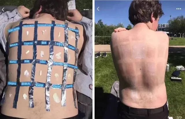 正如防曬圈有一個人盡皆知的測評,即用膠帶隔開涂上多種防曬霜,在太陽下暴曬幾個小時后,通過皮膚曬傷程度來測評防曬效果。