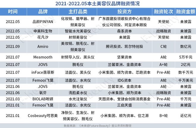 從2021年年初到今年5月,共11家本土美容儀新銳品牌獲得融資,資本助力之下,再次升溫家用美容儀賽道的競(jìng)爭(zhēng)。