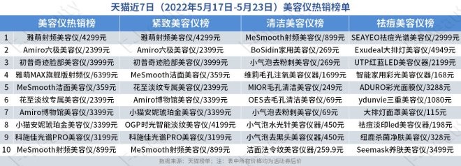 對(duì)比過去一周美容儀、緊致提拉美容儀、清潔美容儀和祛痘美容儀銷量排行可以發(fā)現(xiàn),本土新銳品牌已經(jīng)憑借高性價(jià)比和鋪天蓋地的營(yíng)銷策略占據(jù)市場(chǎng)大半壁江山。