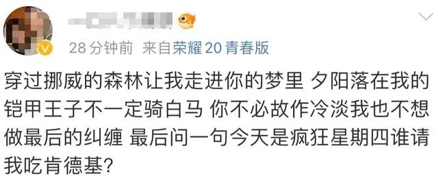 抒情風(fēng)、文藝風(fēng)、沙雕風(fēng)......任何風(fēng)格與熱點(diǎn)配上一句“今天是瘋狂星期四,你愿意請(qǐng)我吃肯德基嗎?”都能組成“瘋四文學(xué)”。