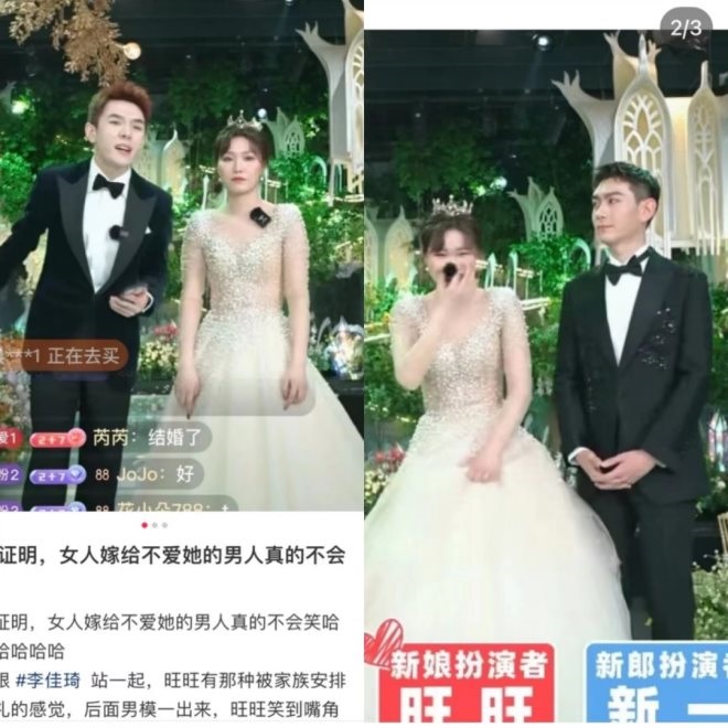 旺旺的出圈則來自于3月1日李佳琦直播帶貨的婚慶專場。“原來女人嫁給自己不愛的人真的不會笑”這句話搭配旺旺的表情火遍小紅書和抖音。當晚,旺旺身穿婚紗,看到男模穿西裝出來時,笑得嘴角咧到耳朵,但跟身穿西裝的李佳琦站一起,就被網友吐槽有被家族安排婚禮的感覺。