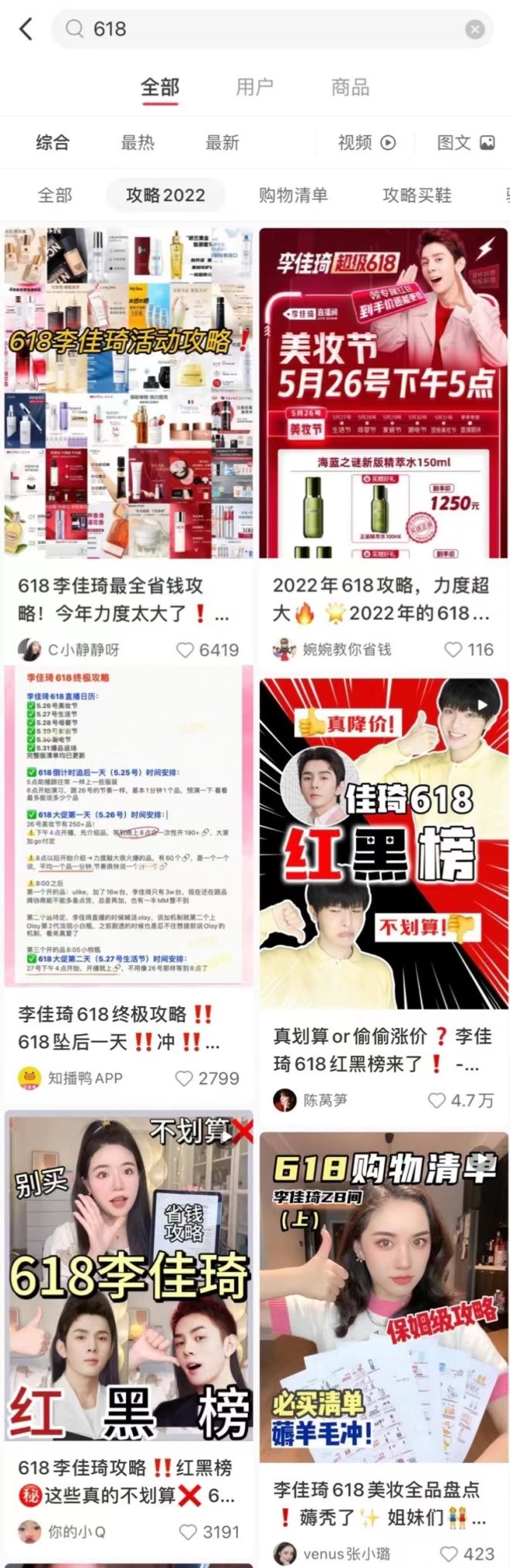而在小紅書,不少消費者搜“618”,收藏評論點贊最多的一定是“618李佳琦直播間全線分析+比價”“爆肝三天三夜,2022年李佳琦618全攻略!保袑Ρ热ツ618和三八節(jié)的,還有對比日上、海南免稅的……多數博主總結下來,李佳琦一共連播6天,近400個產品,歐萊雅、Lamer、SK-II、Olay等大牌相比以往更有誠意,也有品牌因原料、機制相比以往大幅漲價,但大部分都是劃算的。