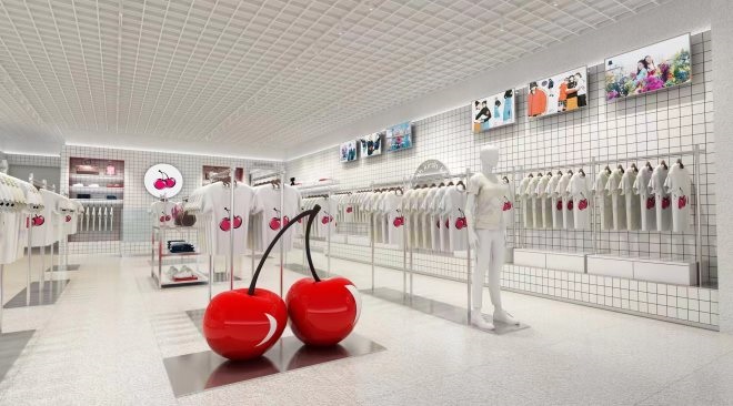 品牌LOGO紅色櫻桃也隨處可見,門口擺放著一米多高的櫻桃雕塑,門店正中央收銀臺(tái)后面的墻壁也懸掛著櫻桃燈牌,收銀臺(tái)兩邊墻壁上分別寫著一排黑色英文KIRSH。