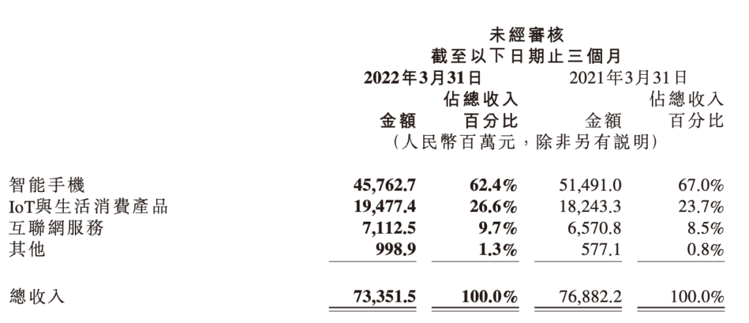 小米各業(yè)務收入情況,圖/小米財報