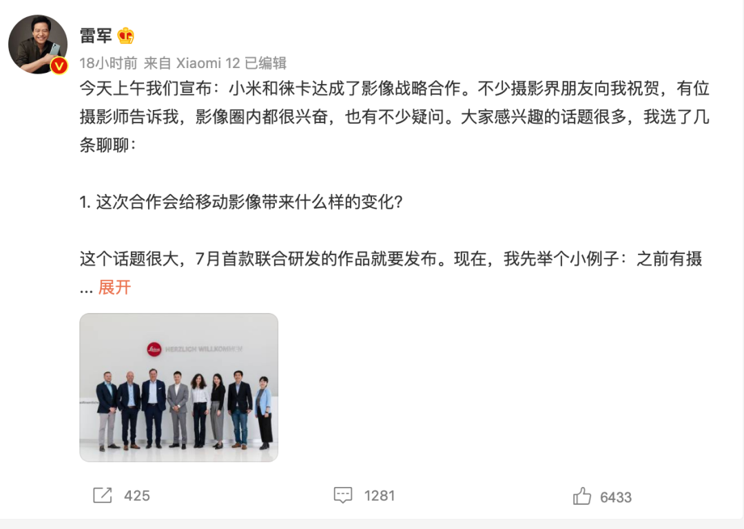 小米與徠卡宣布合作,圖/雷軍微博