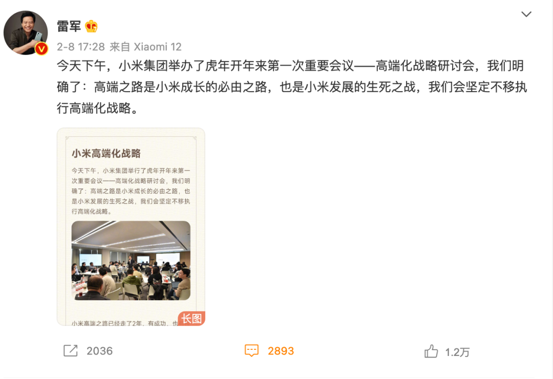 小米組建高端化戰(zhàn)略工作組,圖/雷軍微博
