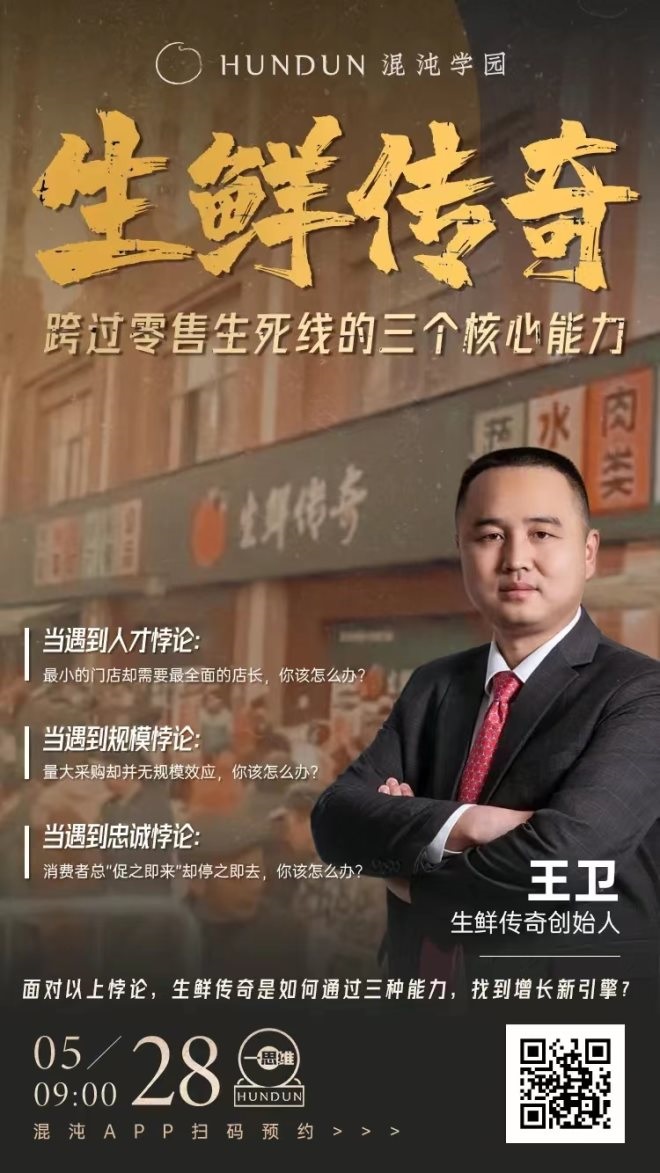 本周六,生鮮傳奇創(chuàng)始人王衛(wèi)老師將做客混沌,從企業(yè)經(jīng)歷的兩次“非常規(guī)戰(zhàn)役”切入,回歸業(yè)態(tài)發(fā)展的底層規(guī)律,探討新零售企業(yè)的生存發(fā)展之道。