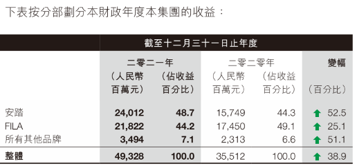 財報顯示,F(xiàn)ILA的營收比重在縮小,所有其他品牌的占比逐年提升。其中,安踏品牌營收同比增長52.5%至240.1億元;FILA品怕營收同比增長25.1%至218.2億元;所有其他品牌營收同比增長51.1%至34.9億元,其中由DESCENTE及KOLON SPORT帶動。