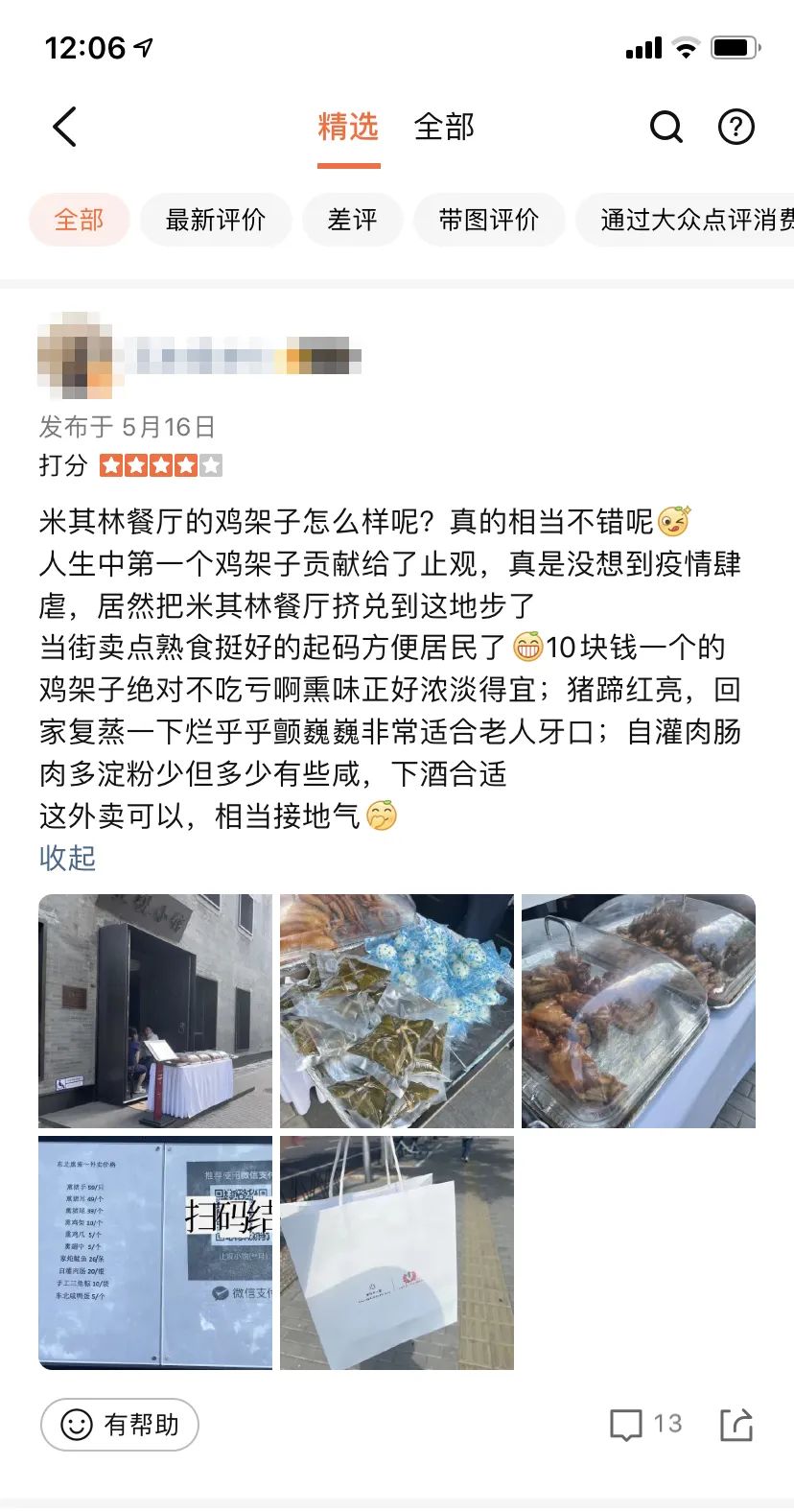 本輪疫情,止觀小館主動出擊在門口外擺,賣起了東北醬熏,5塊錢一個的雞爪、10塊錢一個的熏雞架,不少路過的居民都說:“以前覺得500多的人均,都不太敢進去吃飯,現(xiàn)在10塊、20塊就可以在家門口吃到米其林了,太值得了。”